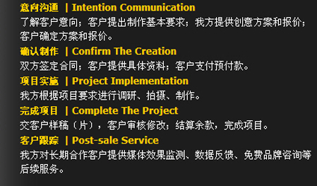 保證力——作業(yè)流程 我們一直相信,只有科學(xué)、規(guī)范的作業(yè)流程作為運(yùn)作保障,優(yōu)秀的創(chuàng)意才能得以完美的實施。在經(jīng)典影視,我們一直秉承——策略精準(zhǔn) . 創(chuàng)意新銳 . 執(zhí)行出色。